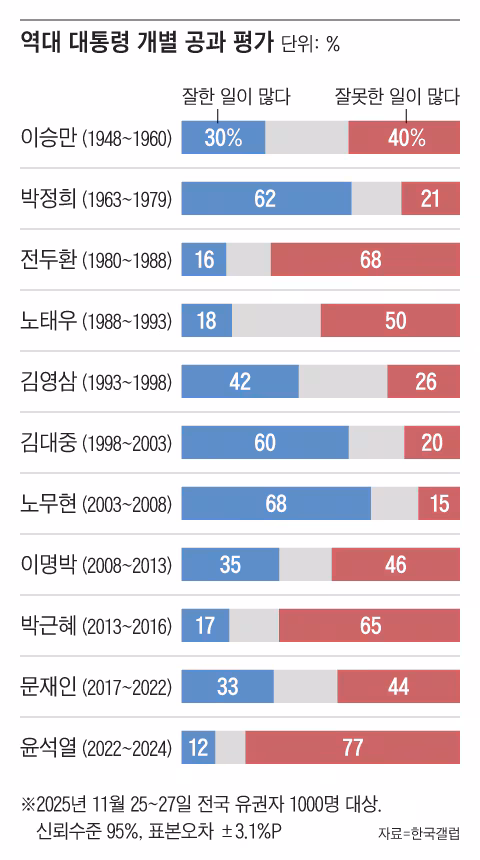 一方、「まちがった仕事が多い」という回答は尹前大統領が77%で最も多かった。尹前大統領は「よい仕事が多い」という答えは12%にとどまった。続いて全斗煥(68%)、朴槿恵(65%)、盧泰愚(50%))元大統領の順で「まちがった仕事が多い」という評価が多かった。李明博(46%)、文在寅(44%)、李承晩(40%)元大統領も、功より罪が多いと評価された。