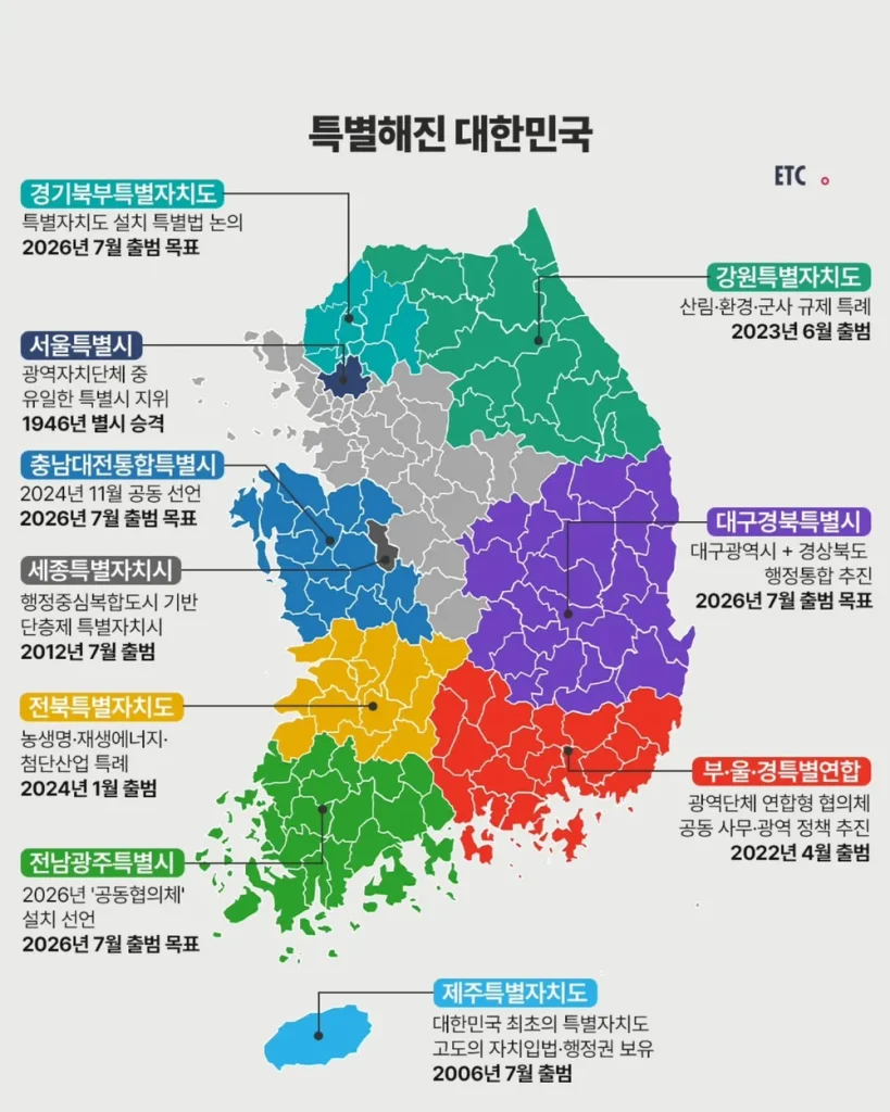 済州道、江原道、全羅北道は「特別自治道」に昇格済み。京畿道を南北に分割して、京畿北道を特別自治道にしようという構想もあり、すべて実現するとソウル特別市も合わせ、韓国のほとんどのエリアが「特別なんちゃら」になるかもしれません。